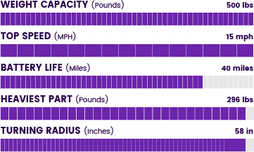 View Item Weight Capacity Top Speed Driving Range Turning Radius Heaviest Piece 325 lbs 4.7 mph 12.75 Miles 36" 35.75 lbs
